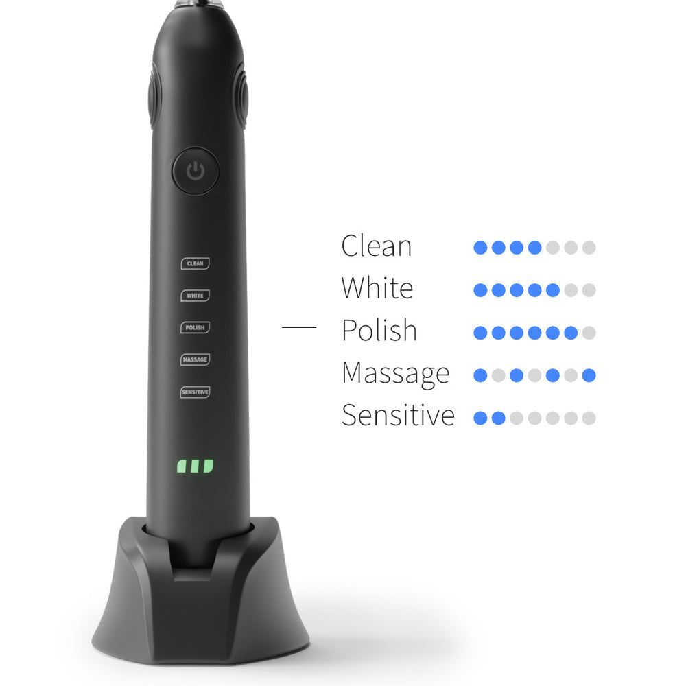 The Olux sonic toothbrush delivers up to 48,000 vibrations per minute, causing the brush head bristles to move laterally. The vibration frequency and intensity can be adjusted based on the selected cleaning mode.